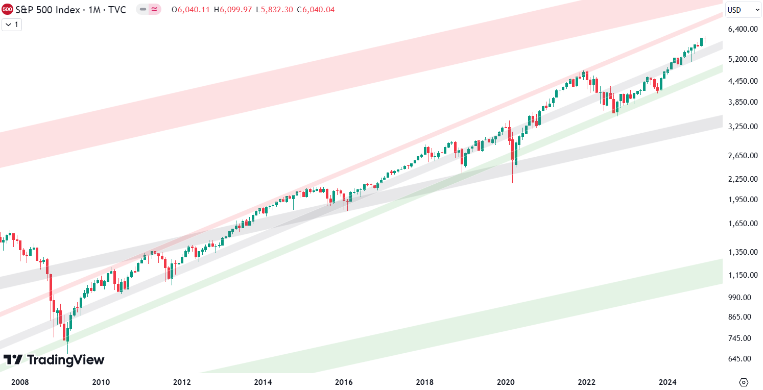 Dropping further down to a monthly chart, where every candle represents one month, we can draw a new set of parallel trendlines—red, green, and grey—capturing the uptrend that began in 2008. These new trendlines form a clear channel for the market’s movement. The red line stopped the market’s advance at the 2021 peak. The green line provided strong support during the formation of the 2022 bottom. Currently, the market is above the grey line, which is expected to act as support for any declines.
