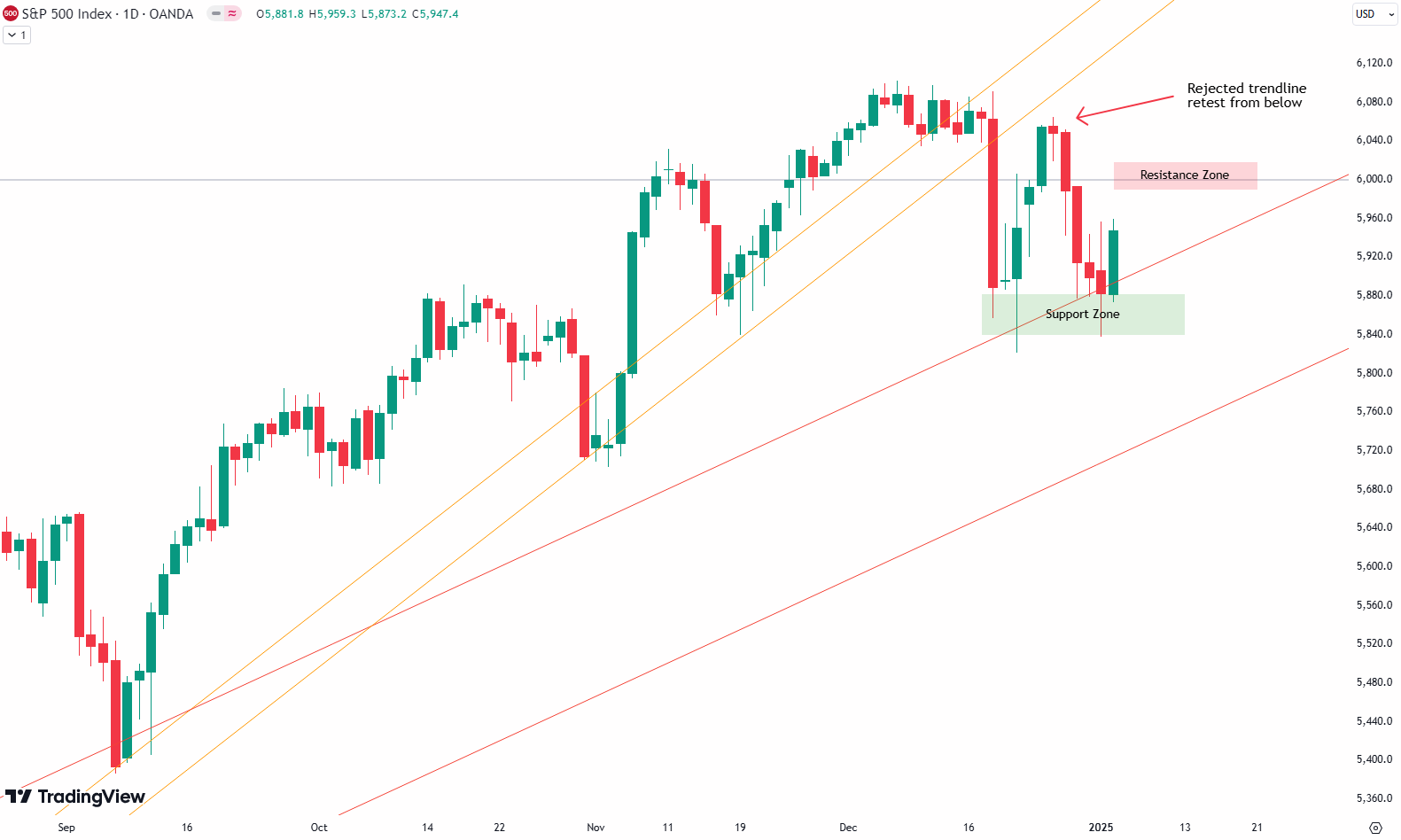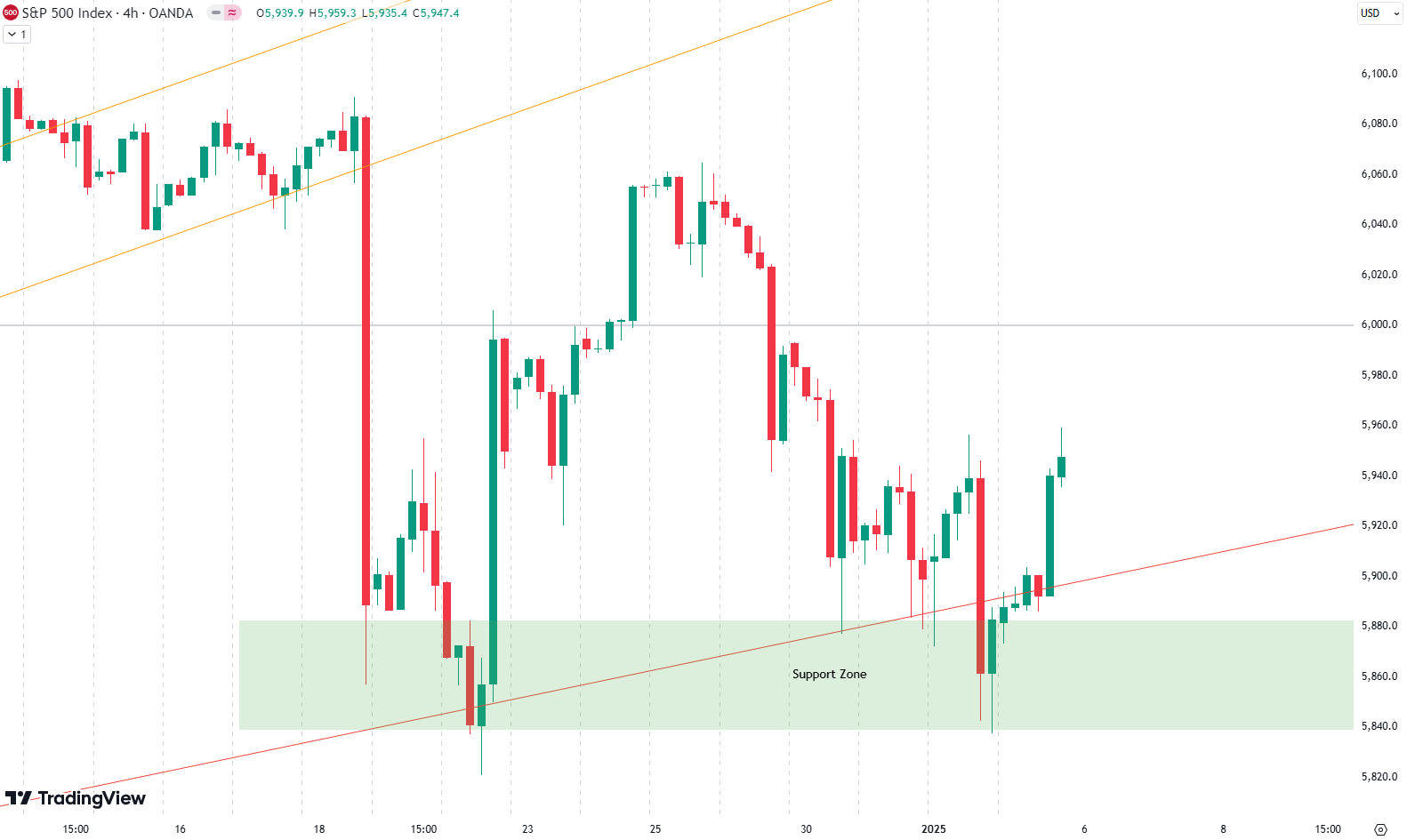 Reviewing the 4-hour chart, we observe the December 18th downturn initiating a corrective phase. Since then, the S&P 500 has twice tested the green support zone and red trend line from the weekly chart. These lines have been essential in marking resistance and support during this period. Crucially, the 6000-point mark remains a pivotal threshold, having resisted upward momentum on multiple occasions.