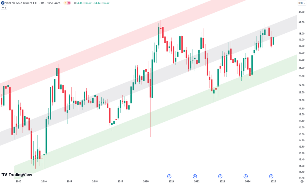 Looking at GDX’s monthly chart, we see a steady upward trend channel framed by a green area at the bottom (support), a red area at the top (resistance), and a gray zone in the middle (a balance point). These parallel lines have provided key levels for price movement for nearly a decade.