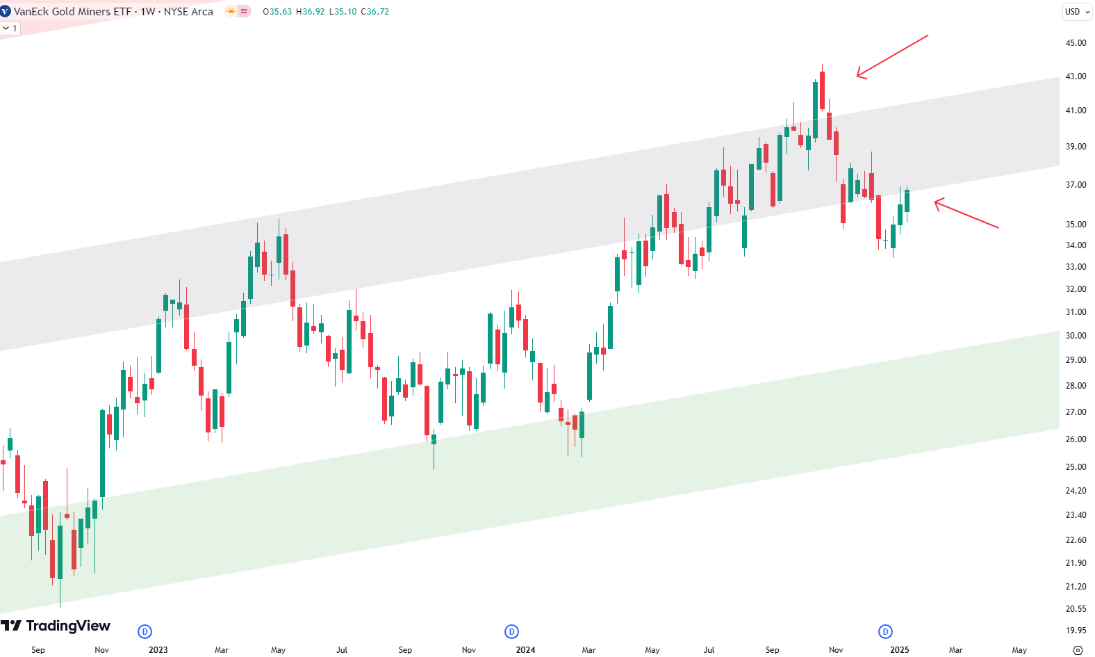 Zooming into the weekly chart since late 2022, GDX recently bounced twice from the green shaded area, demonstrating strong support around these levels. The first bounce in late 2022 saw prices climb to the gray shaded area in mid-2023, where they hit resistance and pulled back.