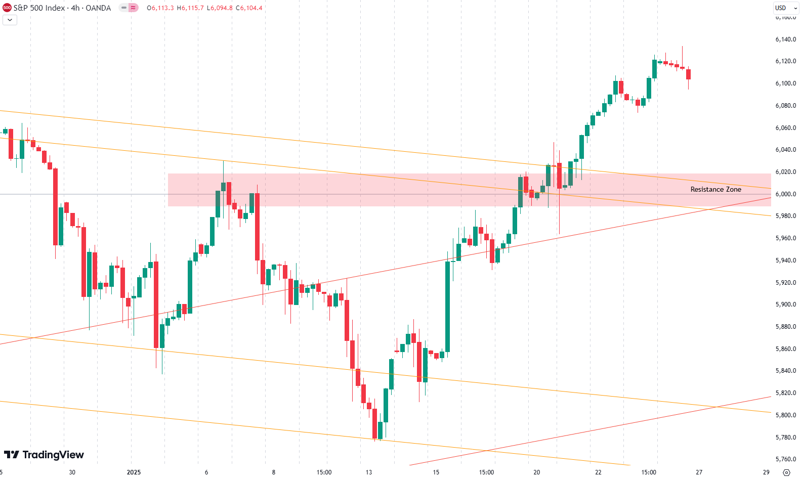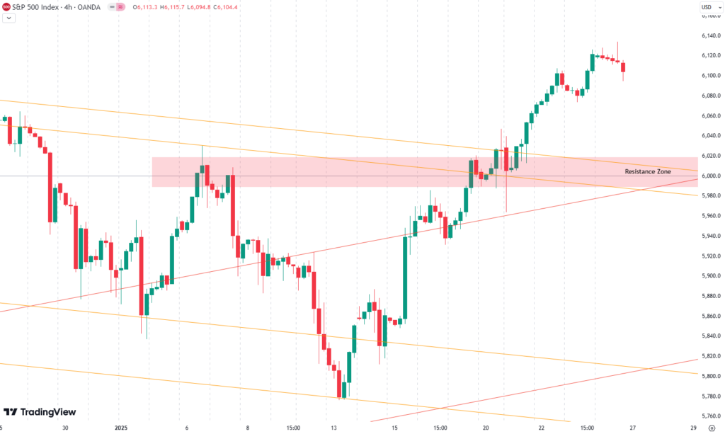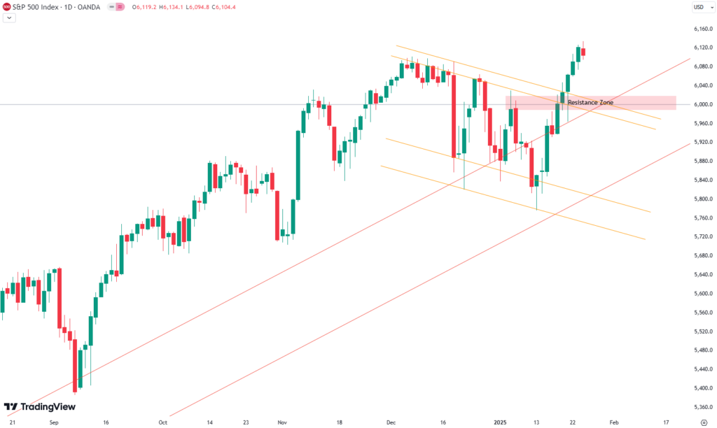 Zooming out to the daily chart, we can see the S&P 500 breaking through a critical resistance zone around the 6,000-point mark. This zone had been highlighted as crucial in previous discussions. It aligns with downward-sloping trend lines on the chart, and the breakout was swift despite some initial volatility.