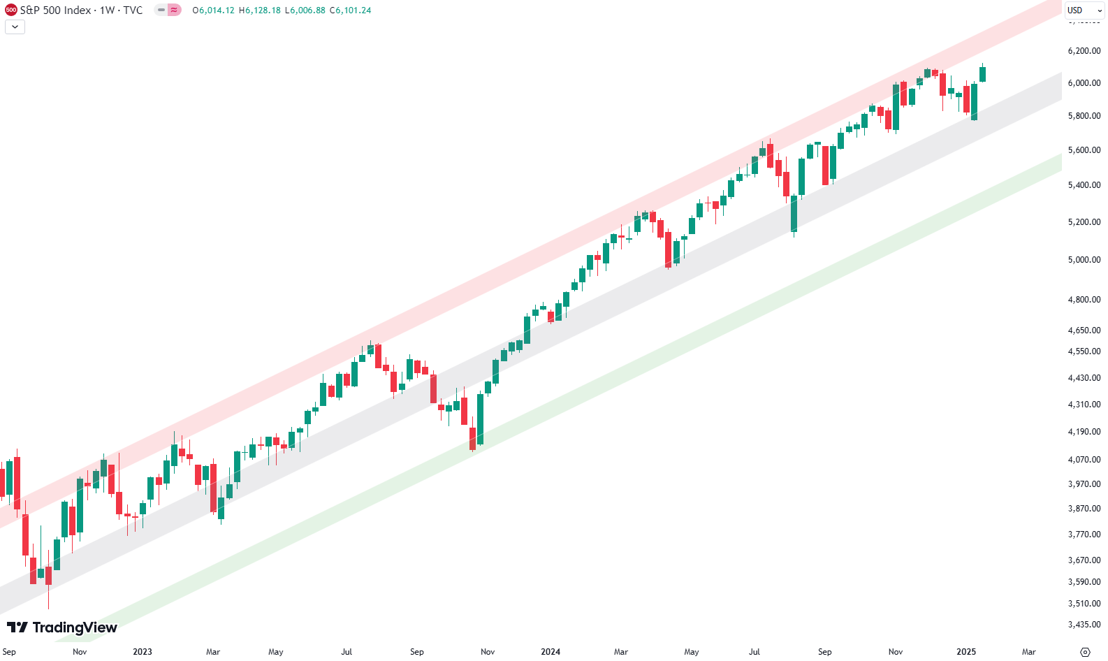 Switching to the logarithmic weekly chart, it’s clear the S&P has moved sharply after testing the grey shaded area. The upward momentum is driving it toward a red-shaded resistance zone. Approaching this area could suggest profit-taking opportunities or limited upside from here—but we’re not there yet.