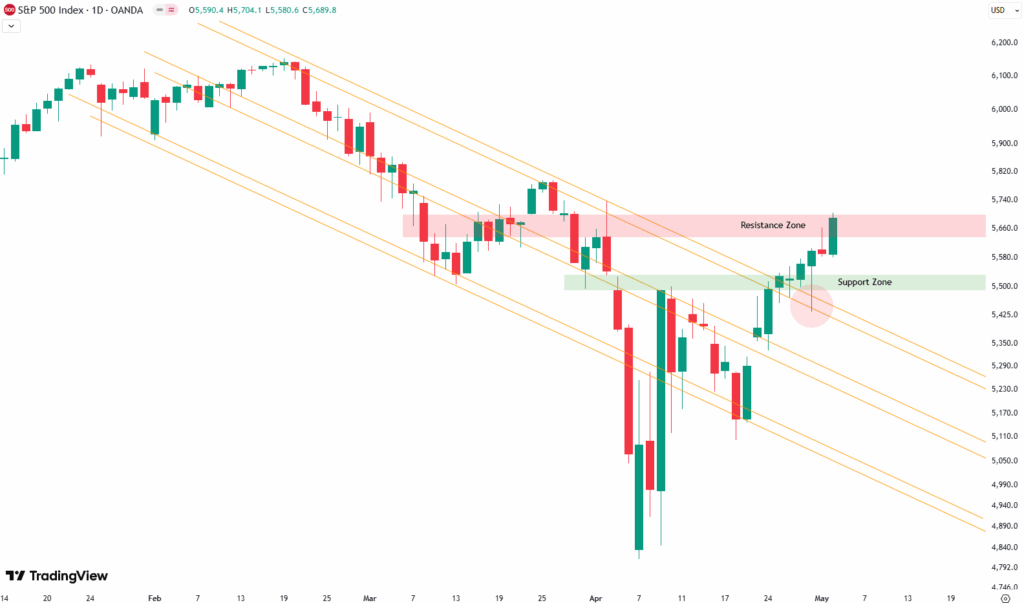 On Wednesday, the S&P 500 retested that orange trend channel — marked on the chart with a red circle — and held strong. That retest, followed by a sharp move higher, also confirmed that the resistance zone had flipped to support. You’ll see that area highlighted as a green support box on the chart.