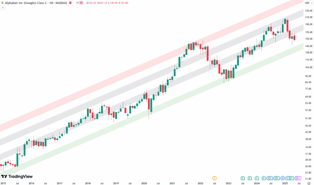 Let’s start with the long-term view. Looking at Google’s chart going all the way back to 2015, you can tell it’s been in a pretty solid uptrend. The chart uses a logarithmic scale — which means it adjusts for percentage changes over time — and the trend has been super clean.
