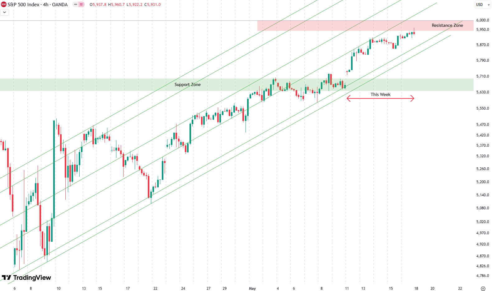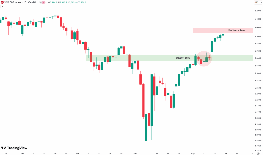 What followed was a powerful upward leg. We’re now heading toward the 6,000-point mark, which is where the next resistance zone begins—marked in red on the chart.