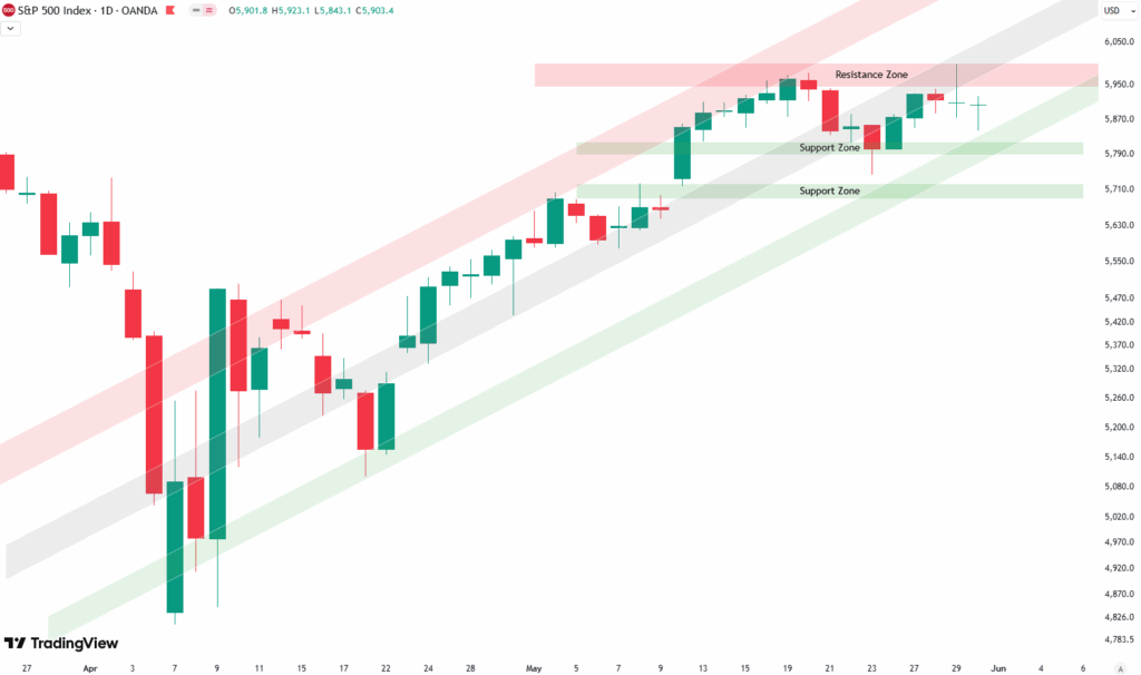 Looking at the daily chart gives us a better perspective on what’s happening. You can clearly see the April bottom and the strong rally that followed. Over the last two weeks, the market has started to flatten out and move more sideways. We’ve now tested the resistance zone twice—this is the same zone we’ve discussed for the past few weeks. So far, the S&P 500 has not been able to break through it.