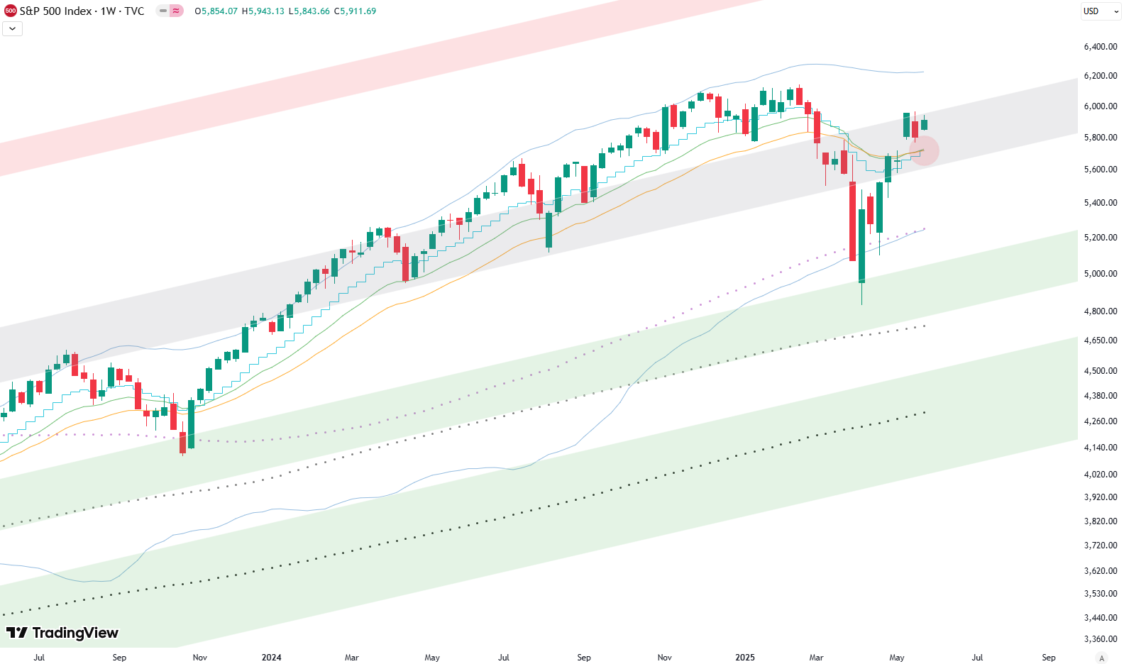Lastly, let’s take a quick look at the weekly chart, which goes back to the second half of 2023. We’ve talked about this in previous updates—how the S&P 500 tested the lower green-shaded area of a long-term upward-sloping trend channel with the April low.