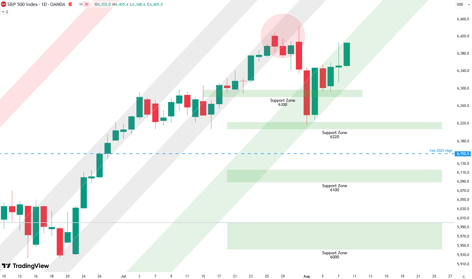 Looking again at the daily candles, we can see the clear support zones where we found support: first at 6,220, and then with the retest of the 6,300 support during this week.