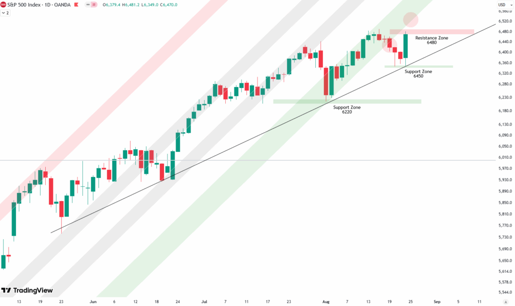We also had the support zone around 6,410 points, which was important to the downside. On Wednesday, we saw a move below that zone. On Thursday, the S&P moved up and down sideways, and then on Friday came the Jackson Hole speech from Powell, where he hinted at possible rate cuts in September. That pushed the market sharply to the upside — you can see the big green candle here. Just before that rally, the price touched and tested the lower part of the black trend channel (the second red circle). It was a very nice test of the channel support, and then we bounced right back up to retest last week’s high, which is now resistance around 6,480, and also aligned with the middle black trend lines. So we can expect a small pullback here. Technically, it’s very clean behavior.