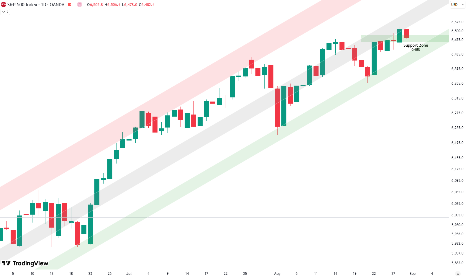 You can also see on the chart, marked with a red circle, that the S&P 500 was rejected at the top of this rising wedge pattern earlier this week. Since then, it has pulled back slightly and is now retesting the support zone around 6,480.