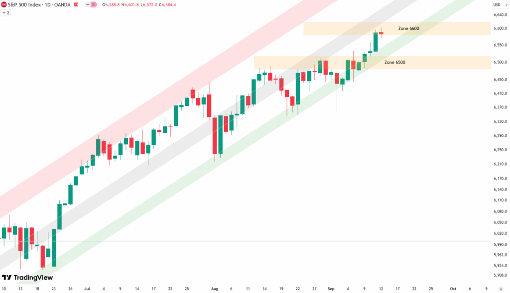 Looking at the 4-hour chart of the S&P 500, we’ve been watching this rising wedge pattern for some time now (marked by the black trend lines). The price has respected this pattern nicely since early August. Again this week, we tested the lower boundary of the wedge (see the red circle), and then we broke out to the upside with a very strong rally on Tuesday, Wednesday, and Thursday. This breakout pushed prices up into the resistance zone around 6,600 points, which is expected to provide some headwinds. On Friday, we already saw prices start to weaken a little. A pullback toward the second red circle on the chart — a retest of the wedge pattern we broke — is now likely. From there, we will see how things develop.