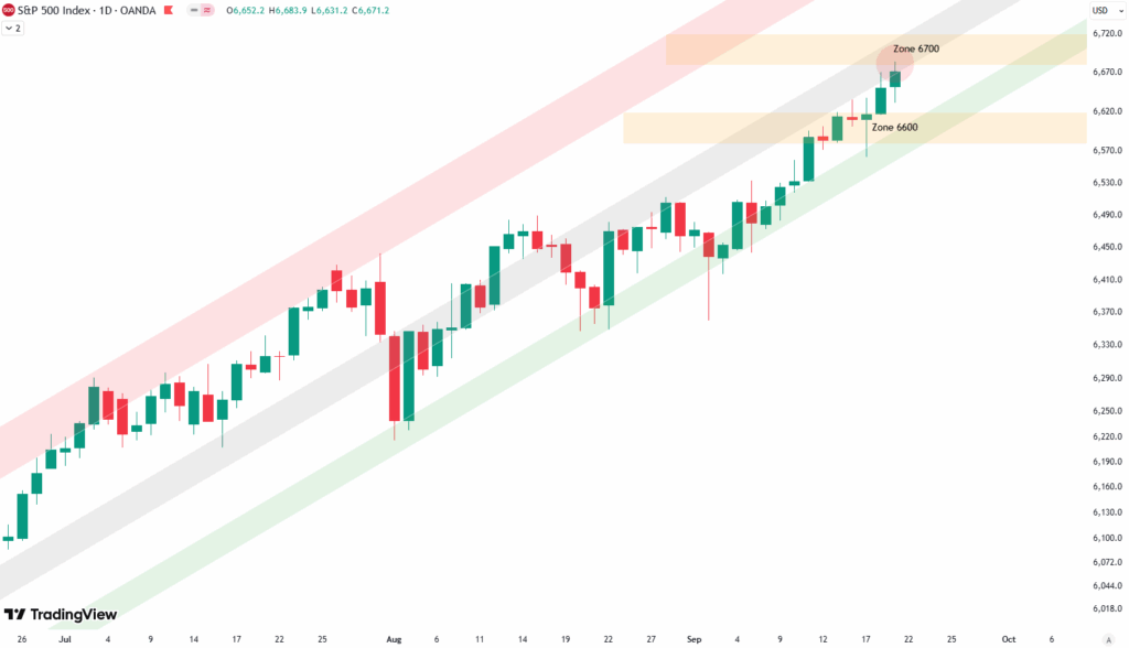 Now, looking at the daily chart, you can see the green, gray, and red shaded areas marking the trend channel. The market has pushed up from the green shaded area at the bottom of the channel and is now touching the gray middle area, which should act as resistance. At the same time, we’re testing the 6,700 resistance zone. This creates a confluence of resistance levels. On top of that, the daily RSI is above 70, signaling an overbought condition. So, caution is warranted here.