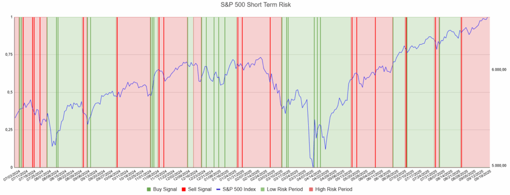 We also want to introduce a new measure: the short-term risk indicator. It is composed of several signals from different asset classes. In the chart, the S&P 500 is shown in blue since July last year. The green and red shaded areas mark low- and high-risk environments, while the vertical green and red lines show buy and sell signals delivered by this indicator.