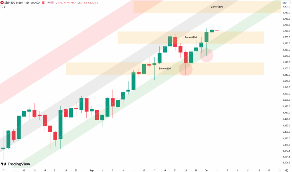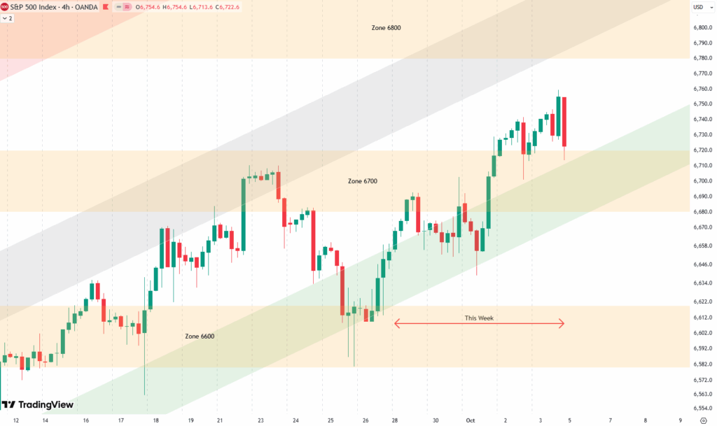 Hello everybody, and welcome to this week’s analysis of the S&P 500. The index finished 1% up this week, marking a good performance despite the government shutdown in the US. The shutdown remains unresolved, and it’s still unclear how long it will continue. Historically, such events have sometimes affected the S&P 500 — though the impact has varied. In this case, the market’s reaction so far suggests a “buy the dip” scenario, but we’ll have to see how things develop.