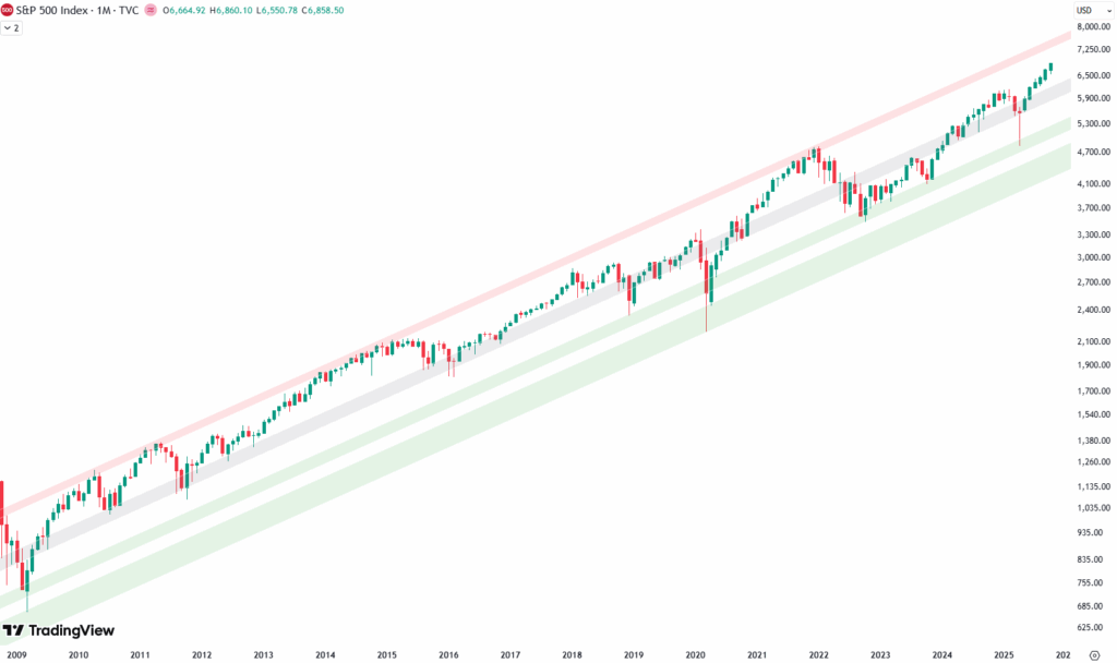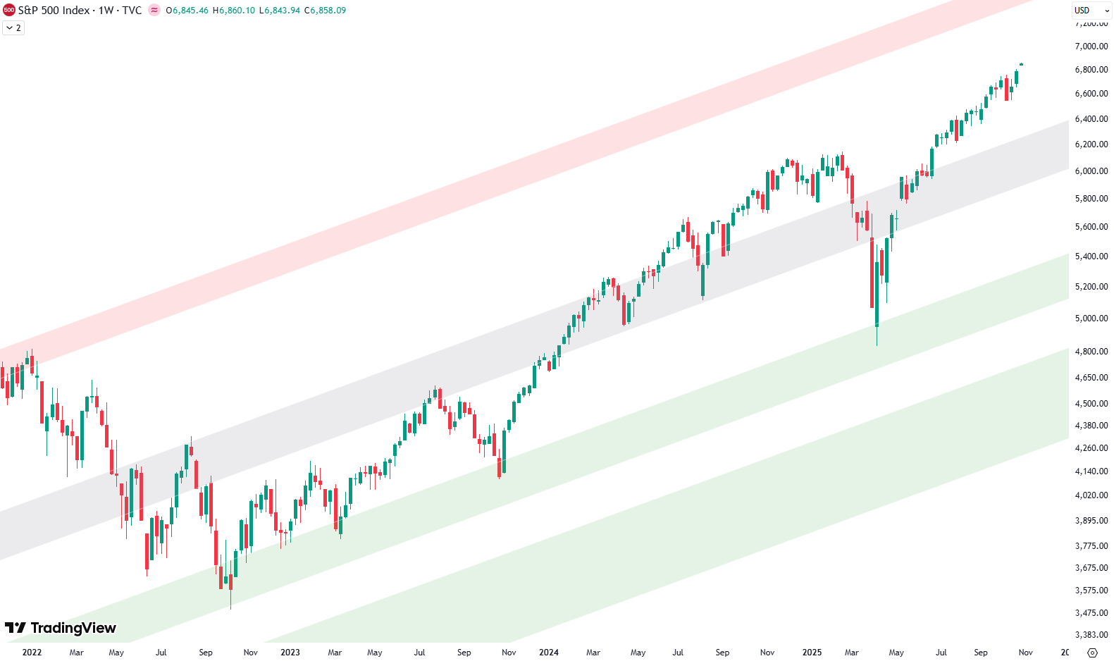 The weekly chart presents a compelling technical picture. Within the same long-term trend channel that originated from the 2009 low, we observe the familiar green, red, and gray shaded zones that have guided price action for more than a decade. The left portion of the chart clearly shows the 2022 market top, followed by the subsequent low, where the green shaded area provided exceptional support during that critical period.