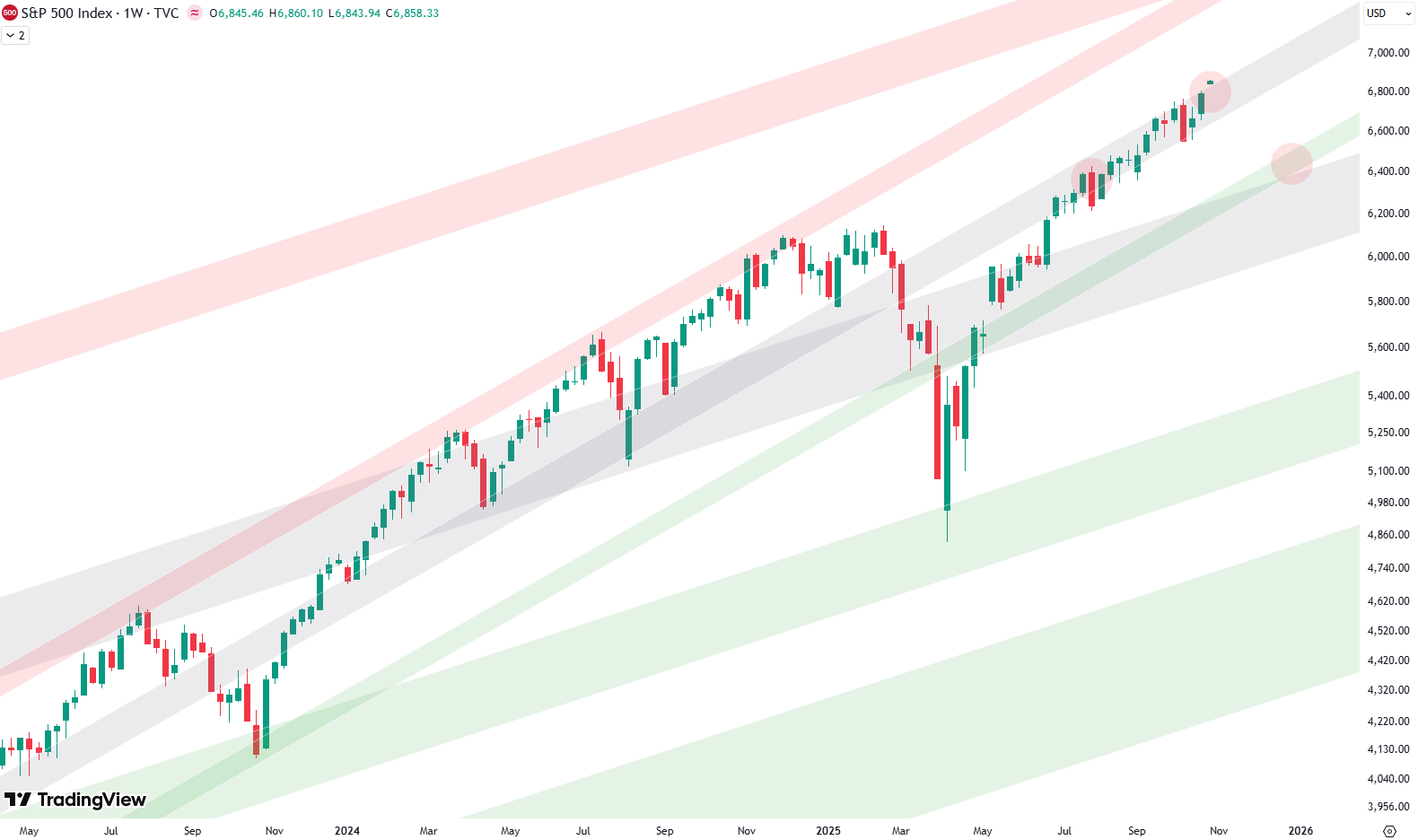 For the last several months, price action has been hovering around the gray shaded area of this shorter-term channel. This is highlighted by two red circles on the chart. The first marks a pullback but that was followed by another strong rally, again rising at the same angle as the gray zone. Since then, prices have remained within this region, reflecting both the strength and persistence of the trend.