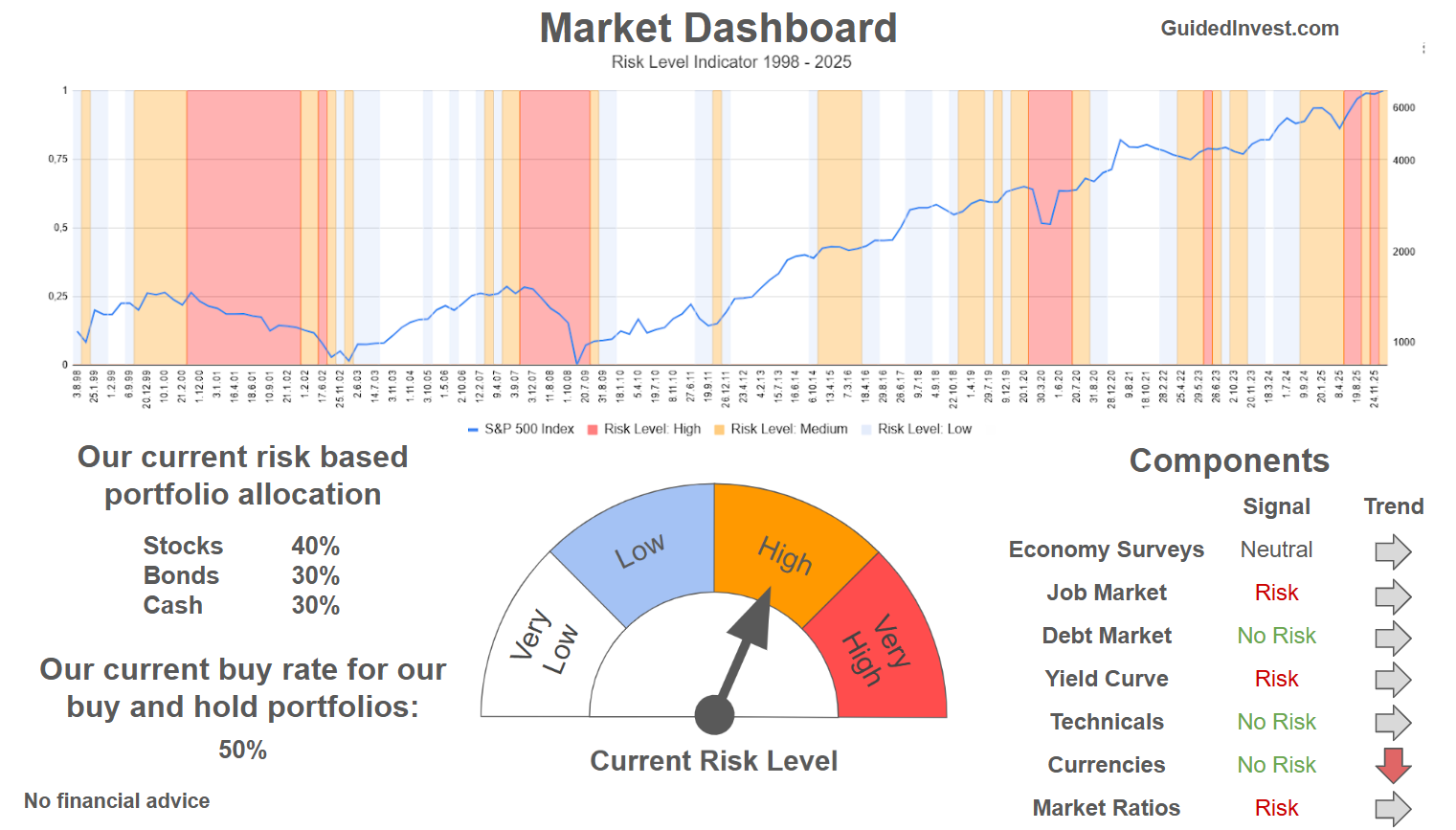 Our Market Dashboard provides a quick overview of the current market conditions and, more importantly, the associated risk. You can view a chart of one of our tools, the Risk Level Indicator, showing predicted risk from 1998 to 2025. If you are interested, you can visit our Dashboard site here.