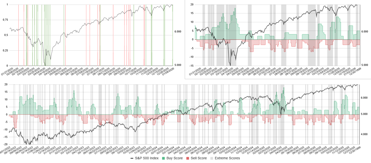 Last week, both buy and sell scores were fairly balanced. This week, we saw a slight pullback in price, but the buy score increased to around 6. Since a buy signal is triggered when the score rises above 5, this resulted in a buy signal on Friday. You can see this as a vertical green line on the top-left chart.