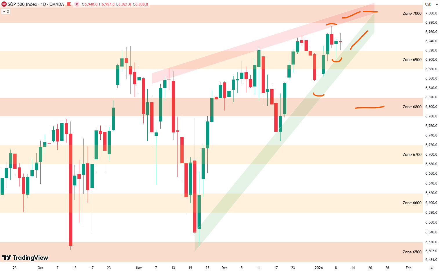 The upper red shaded area aligns with the recent all-time highs and acts as resistance. Parallel to that, the lower green shaded area connects with the November low and defines potential support. In the middle, the gray shaded area lines up well with this week’s low. What is interesting here is that the measured move target from the wedge break also aligns closely with the 6,600-point area, creating a zone of confluence if price were to move lower.
