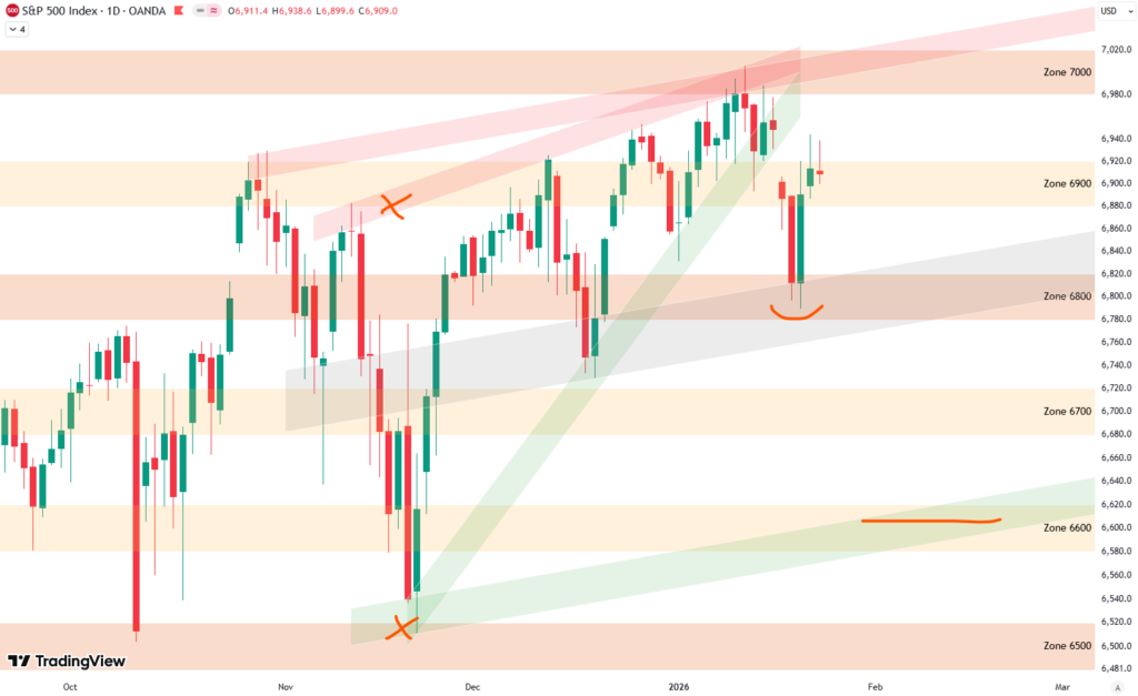 This move tested the 6,800-point area on the downside and then recovered enough to close near the 6,900-point zone, which remains an important level. The initial drop was driven by an escalation around the US–Greenland topic, followed by a de-escalation later on, which helped fuel the rebound. Overall, the drop from the highs was around 3% in a short period of time, while the rebound into the end of the week recovered roughly 2.2%. So despite significant volatility, the net move for the week was relatively small.