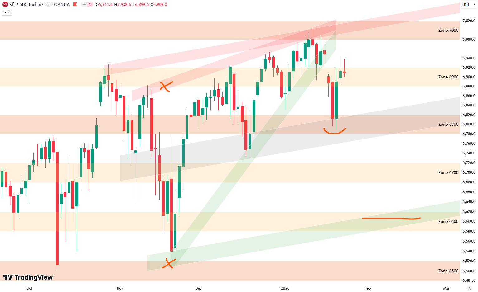 Now let’s look at the daily chart. Two weeks ago, we discussed the rising wedge formation that had been building since November and marked several important support zones in case that formation broke. On that earlier chart, I highlighted the 6,800-point zone as a key support level if the wedge were to break.