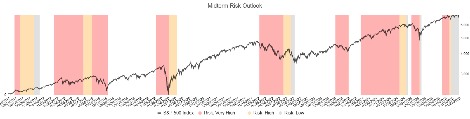 Finally, I want to introduce a new chart that we will also be using going forward: the mid-term risk outlook. This model combines several different signals and indicators across multiple asset classes, weighted into a single framework. It covers data going back to 2017 and defines four distinct risk zones for the S&P 500.