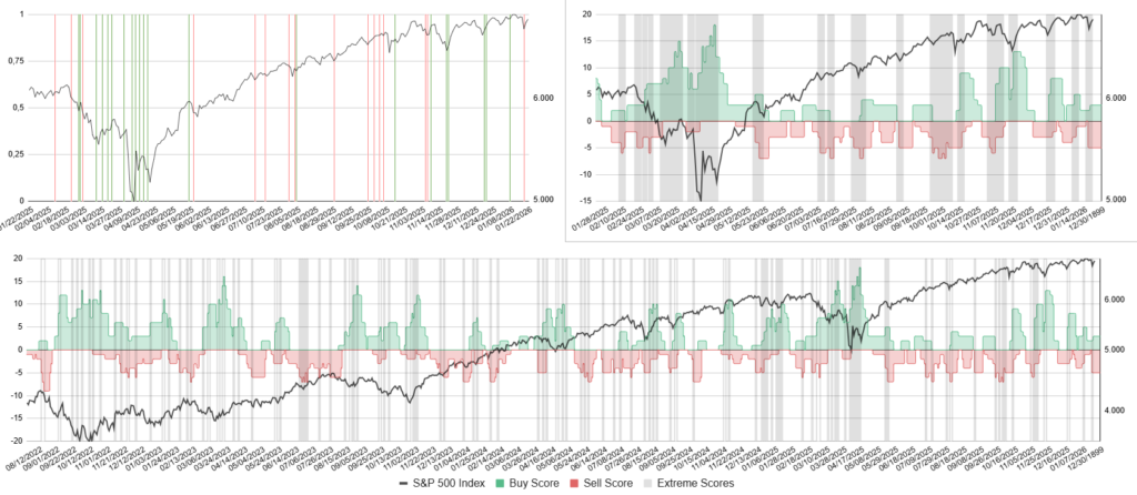 Now let’s turn to our short-term risk outlook. In this indicator, the S&P 500 is shown in black, the buy score in green, and the sell score in red. The bottom panel shows the broader context, the top right shows a zoomed-in view, and the top left displays the resulting buy and sell signals as vertical green and red lines.