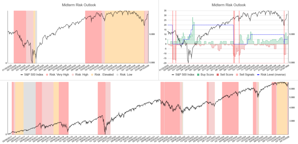 Bottom: S&P 500 in black with risk regimes ranging from very low to very high (white, grey, orange and red shaded areas).