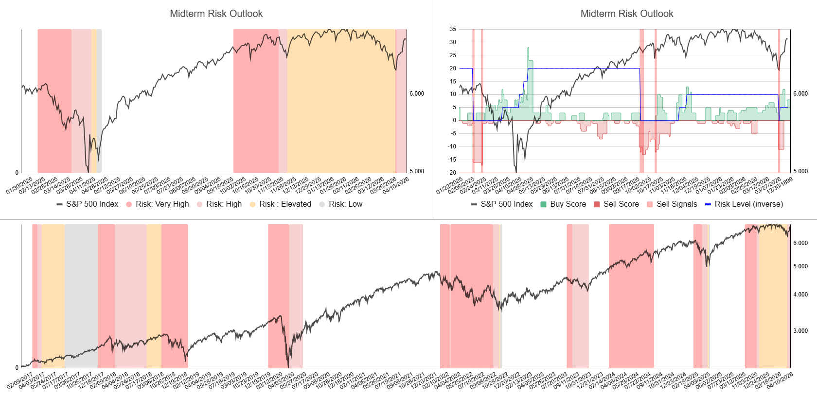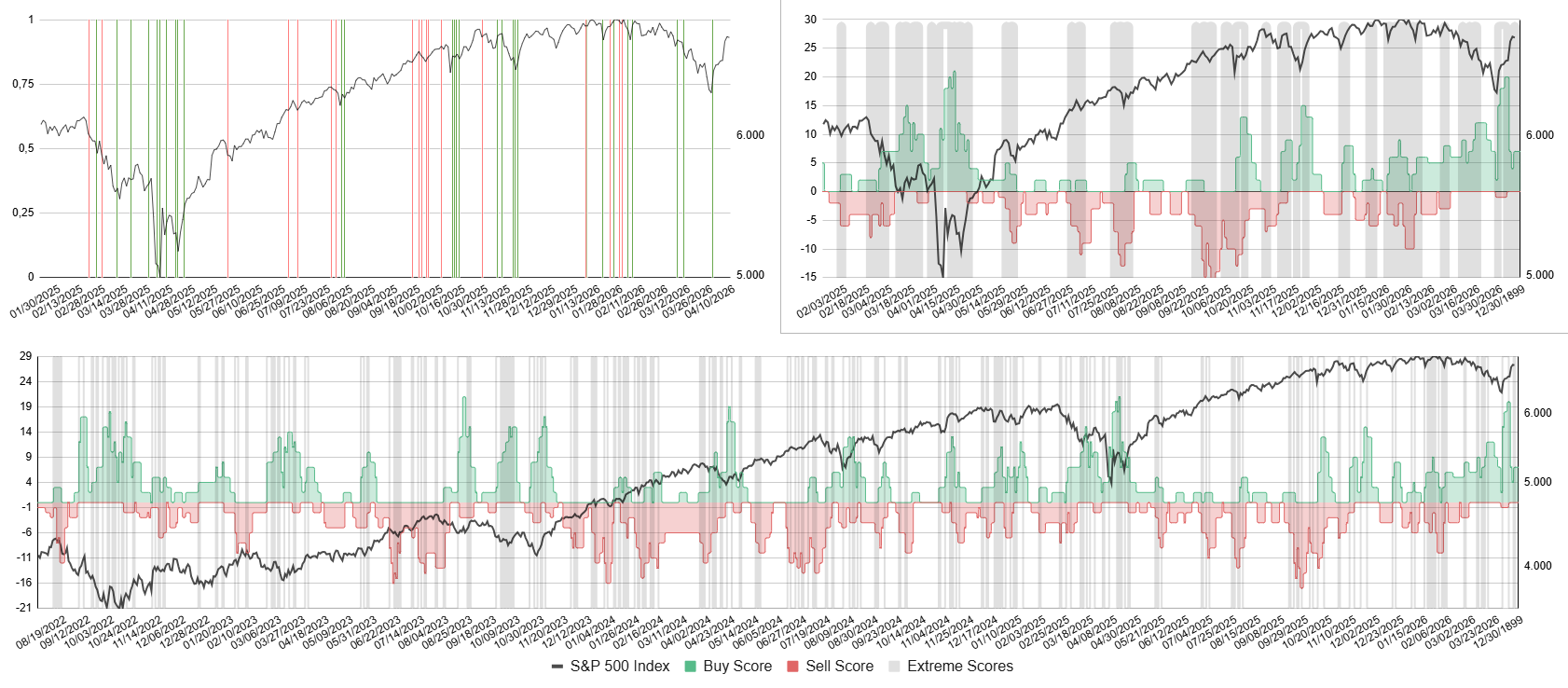 Bottom: Buy score in green, sell score in red, S&P 500 in black.