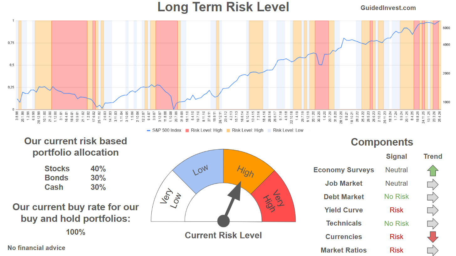 Our Market Dashboard provides a concise overview of current market conditions and, more importantly, the associated risk levels. You’ll find a chart featuring our Risk Level Indicator, tracking predicted risk trends from 1998 to 2026. In the center, we display the risk level we currently associate with today’s market conditions. The Risk Level Indicator includes several components, viewable on the bottom right, with trends indicated by color: red for worsening, green for improving, and gray for neutral. On the left, we offer our risk-based portfolio allocations alongside our current buy rate for our buy-and-hold portfolios. Please note that this information is not financial advice.